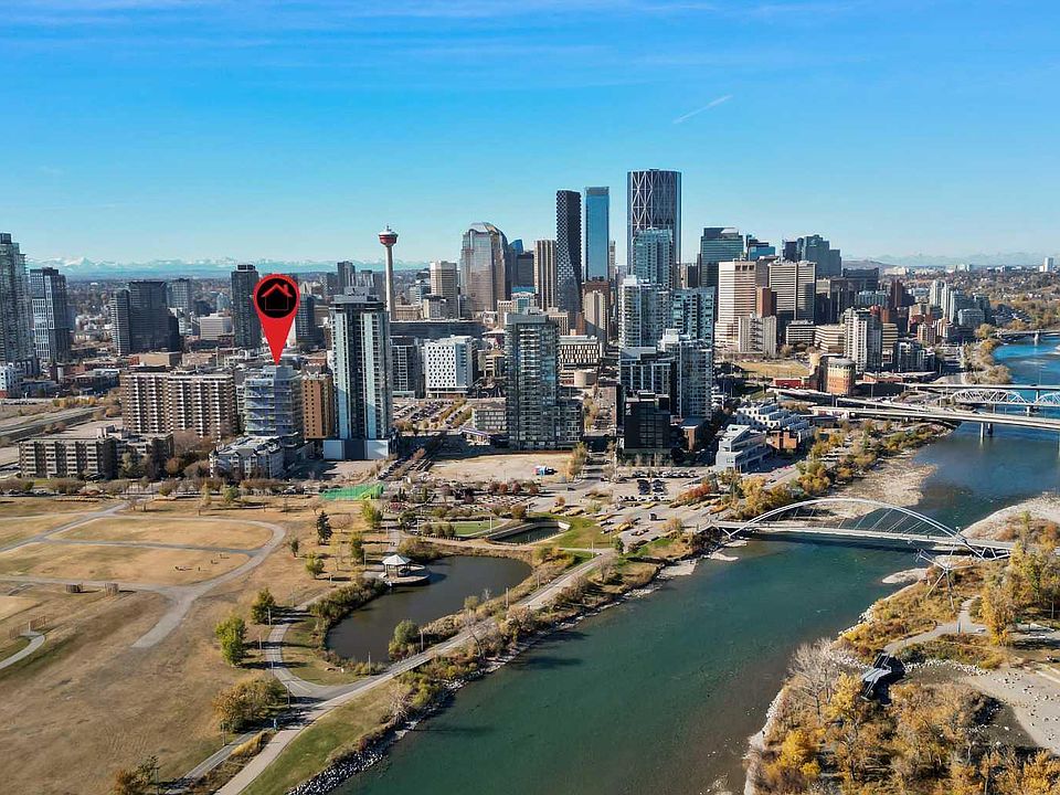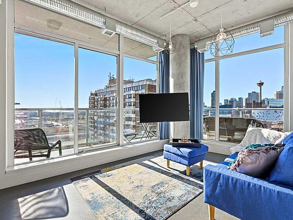 Experience modern city living at its best in this stylish 2-bedroom, 1-bath corner unit at INK by Battistella, perfectly positioned in Calgary’s vibrant East Village. Whether you’re a first-time buyer, a savvy investor, or a downsizer, this home delivers the perfect blend of bold design, intelligent functionality and unbeatable location. Perched on the 11th floor and quietly set at the end of the hall, this pet-friendly, short-term rental approved condo showcases an industrial-chic aesthetic with polished concrete floors, exposed ductwork, and soaring 9.5’ windows that fill the space with natural light. The sleek kitchen features quartz countertops, high-gloss cabinetry, and stainless-steel appliances, opening seamlessly into a bright, open living area that’s perfect for entertaining or relaxing. Two well-separated bedrooms offer versatility for a roommate setup, guest room, or home office, while the modern 4-piece bath adds a touch of everyday luxury. Step out onto your wrap-around balcony to take in breathtaking south-facing views of the Calgary Tower, Stampede Grounds, and downtown skyline—an ideal backdrop for morning coffee, evening sunsets, and Stampede fireworks. Additional perks include in-suite laundry, titled underground parking, storage locker, and impressive building amenities such as a rooftop patio, penthouse recreation room, bike storage, visitor parking, and a pet wash station. From your doorstep, enjoy easy access to the C-Train, Studio Bell, Superstore, cafés, parks, the Saddledome, and the Bow River pathways. This is your opportunity to live or invest in one of Calgary’s most dynamic and walkable urban communities.