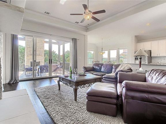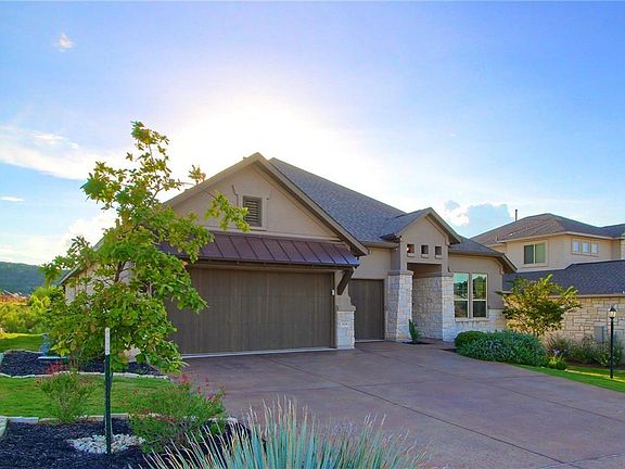 Welcome Home to this stunning one story home on the greenbelt with hill country views, indoor & outdoor fireplace, outdoor kitchen and so much more! The interior sports upscale, modern amenities including chef's kitchen, huge center island, stainless appliances, wood floors, 3 full baths, and grand master. You'll love the exterior, landscaping, oversized patio with greenbelt view, fireplace & outdoor kitchen. Enjoy the best neighborhood amenities here at Rough Hollow on Lake Travis!