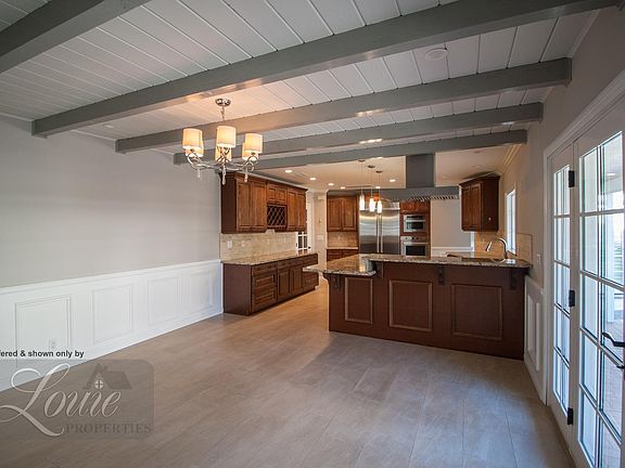 Opening the french doors to the back of the foyer leads into the dining area and open kitchen. Dining area has a fireplace and french doors leading to the backyard. Kitchen has granite counter-tops and all stainless steel appliances; double door refrigerator, cooktop, hood, wall oven, and wall microwave. Plenty of cabinet space and a wine rack.