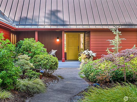 Embrace the tranquility from this inviting oasis in the peaceful Edgemoor neighborhood. This beautifully designed home offers floor-to-ceiling windows that capture abundant natural light and frame views of the lush yard and gardens–-seamlessly merging indoor and outdoor living. Enjoy the serenity of a fenced and professionally landscaped yard, complete with a spacious patio with vibrant seasonal colors. The kitchen is both functional and inviting, opens into a cozy seating area. Relax by the fireplace in this comfortable living room. Two primary bedrooms, one on each floor, provide flexible living arrangements. The downstairs suite includes an adjacent den with a wood-burning fireplace. Stunning Bellingham Bay views from upstairs rooms!