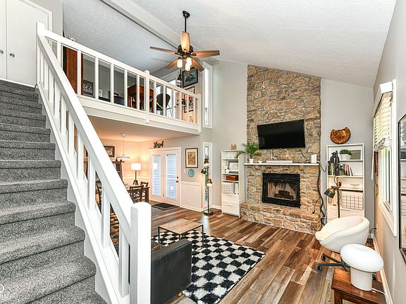 Conner Creek with 2 car garage, private patio and upper deck. Walking distance to restaurants, shops and downtown Fishers. 2 story great room, end unit with plenty of natural light. 10x10 workshop/hobby room or storage off of the garage, 2 bedrooms with loft, loft has an exterior balcony perfect for sitting outside and relaxing, loft is plumbed for a wet bar, large master bedroom and bathroom, with walk in closet, great room with fireplace, dining area, kitchen and laundry area, half bath on the main level with 2 full bathrooms upstairs. HVAC replace 2020, Water heater replaced in 2021, Garage doors and door opener replaced 2020, Crawl space has been incapsulated and dehumidifier installed, kitchen appliances replaced in 2019