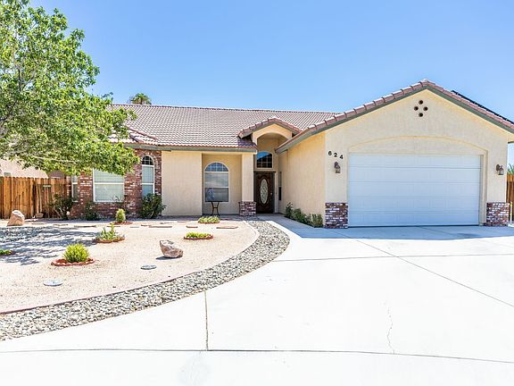 This 4 bedroom 2 bathroom home has manicured low maintenance front landscaping. Tiled entryway with natural lighting. The spacious living room features vaulted ceilings, plush carpet flooring and a fireplace. Large dining area with tile flooring, a lighted chandelier and rear patio access. The kitchen hosts tile countertops, drop-in stove, microwave hood, stainless steel dishwasher, a large island that adds plenty of counterspace and additional cabinetry. There is a large indoor laundry room with cabinetry, counter space and sink. The three guest bedrooms are generously sized. The hall bathroom has a large single sink vanity, tub with a tiled shower surround and glass bypass doors. The main suite is spacious with vaulted ceilings. The main suite's bathroom hosts a large dual sink vanity, large corner soaking tub, a large walk-in tile shower, a privacy closet and a walk-in closet. The rear yard hosts a covered patio with ceiling fans, a lush green lawn, storage shed and concreted R/V parking! Home is equipped with evaporative cooling along with a solar system. Come take a look!
