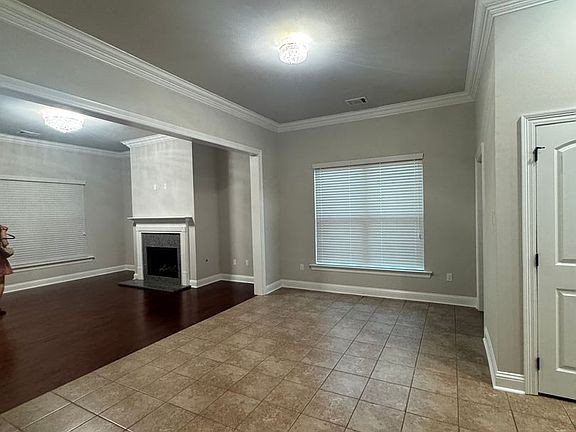 Welcoming Living Areas: Spacious living room with rich hardwood floors, elegant crown molding, and a cozy gas fireplace. The adjoining dining area is framed by large windows that fill the space with natural light.
