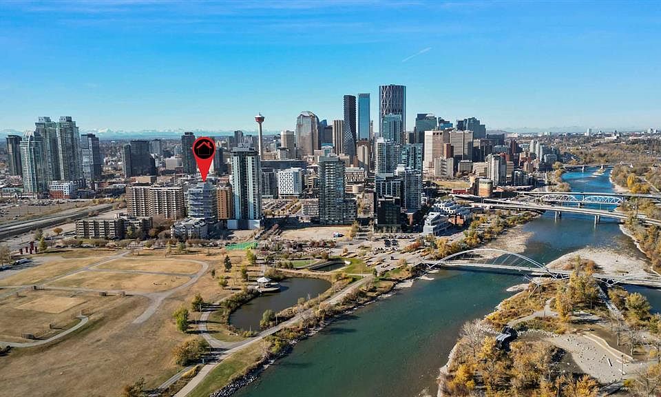 Experience modern city living at its best in this stylish 2-bedroom, 1-bath corner unit at INK by Battistella, perfectly positioned in Calgary’s vibrant East Village. Whether you’re a first-time buyer, a savvy investor, or a downsizer, this home delivers the perfect blend of bold design, intelligent functionality and unbeatable location. Perched on the 11th floor and quietly set at the end of the hall, this pet-friendly, short-term rental approved condo showcases an industrial-chic aesthetic with polished concrete floors, exposed ductwork, and soaring 9.5’ windows that fill the space with natural light. The sleek kitchen features quartz countertops, high-gloss cabinetry, and stainless-steel appliances, opening seamlessly into a bright, open living area that’s perfect for entertaining or relaxing. Two well-separated bedrooms offer versatility for a roommate setup, guest room, or home office, while the modern 4-piece bath adds a touch of everyday luxury. Step out onto your wrap-around balcony to take in breathtaking south-facing views of the Calgary Tower, Stampede Grounds, and downtown skyline—an ideal backdrop for morning coffee, evening sunsets, and Stampede fireworks. Additional perks include in-suite laundry, titled underground parking, storage locker, and impressive building amenities such as a rooftop patio, penthouse recreation room, bike storage, visitor parking, and a pet wash station. From your doorstep, enjoy easy access to the C-Train, Studio Bell, Superstore, cafés, parks, the Saddledome, and the Bow River pathways. This is your opportunity to live or invest in one of Calgary’s most dynamic and walkable urban communities.