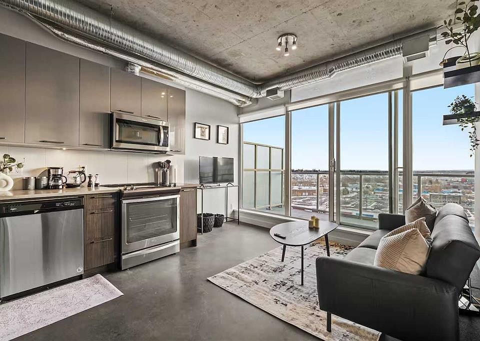 Welcome to INK by Battistella—where modern design meets vibrant downtown living. Perfectly situated in the heart of East Village, this striking condo is ideal for first home owners and professionals seeking a stylish urban retreat! Just steps from the City Hall LRT, Superstore, the award-winning Central Library, National Music Centre, Studio Bell, RiverWalk, and St. Patrick’s Island, this is truly the best of Calgary at your doorstep. Inside, this sun-drenched south-facing residence showcases uninterrupted views of the Saddledome and Stampede Grounds through expansive floor-to-ceiling windows. The industrial loft-inspired design exudes sophistication with 9’ exposed concrete ceilings, matte polished concrete floors, and central air conditioning for year-round comfort. The open-concept layout includes a versatile den/office (currently used as a bedroom), spacious primary bedroom, and a sleek 4-piece bathroom. The kitchen is a showpiece in itself, boasting quartz countertops, glossy metal upper cabinetry, premium hardware, and full-size stainless-steel appliances—seamlessly blending function and style. With in-suite laundry and a modern floorplan, this residence is perfectly tailored for the urban lifestyle. Whether you’re seeking your own inner-city sanctuary or a rental investment, INK offers a rare opportunity to own in one of Calgary’s most dynamic communities!