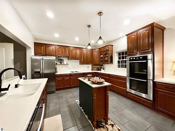 Beautiful 4–5 Bedroom Home on Lakewood on the Green Golf Course – Cadillac West. Overlooking Hole 3 of Lakewood on the Green, this 4,000+ sq. ft. home on two lots offers space, comfort, and character. A bright living room features cathedral ceilings, skylights, and a wood-burning fireplace, while the open kitchen with double oven connects to two dining areas—ideal for gatherings. All four bedrooms include attached baths and walk-in closets, plus a main-floor office that doubles as a guest room or nursery. Upstairs, a Jack-and-Jill bath designed for kids features non-slip flooring, extra storage, and easy access between bedrooms. The finished walkout basement includes a cozy gas fireplace den, theatre room, relaxing sauna, and an additional sleeping area with bath. Some original finish work remains, offering timeless charm and room for thoughtful updates. Spacious, welcoming, and full of potential—this home is perfect for family living and ready for its next chapter.