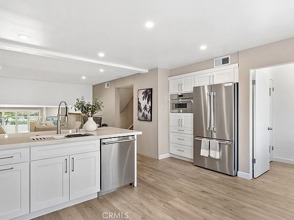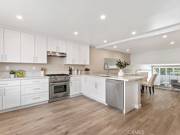Stunning, completely remodeled almost 1,900 SF Villa Valencia townhome with attached 2-car garage with direct access! Located in the heart of Warner Center adjacent to dining/shopping at the Westfield Mall & Village, shops and eateries off Topanga Canyon, and minutes to the beach with easy freeway access. Boasting the largest floor plan in the complex, this thoughtfully renovated townhome greets you with a private gated courtyard with Spanish Saltillo and patterned tile flooring. Step inside where you'll find a formal entry with coat closet with new wide plank luxury vinyl flooring found throughout. The entry opens to the spacious sunlit living room featuring fireplace and large glass sliding door that leads out to the front patio. The remarkable chef's designer kitchen has been completely remodeled boasting real quartzite stone countertops, soft close cabinetry, breakfast bar seating, and a Thermador stainless appliance suite including built-in range with oven/stove, fridge, microwave, and dishwasher. The kitchen opens to the separate formal dining room with sleek modern glass railing which overlooks the living room. This level also has a convenient guest powder bathroom and separate laundry room with storage cabinets. Upstairs you will find two oversized bedroom suites. The primary bedroom has a double door entry, large wraparound closet with built-ins plus additional walk-in closet, and private en-suite upgraded bathroom with dual sinks, walk-in shower, and separate bathtub. The second bedroom suite could also serve as den/bonus room featuring double door entry, high vaulted ceiling, wet bar with sink, Juliet balcony overlooking the complex, large walk-in closet, and access to its own upgraded bathroom with walk-in shower. The two-car garage has built-in storage and has direct access to the townhome. The complex amenities include swimming pool, spa, and picnic area, and nicely landscaped grounds. Don't miss this rare offering!