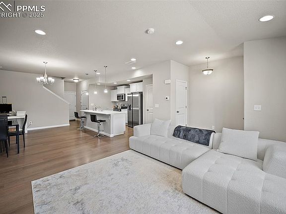 Discover your ideal home in this exquisite 3-bedroom, 2.5-bath townhome. Tucked away in the master planned community of Lorson Ranch, which features parks, trails and an in-community school, this upscale home is filled with upgrades and space. Entering the home from the covered front porch, you'll be greeted by the impressive 9' ceilings, LVP flooring, and open floor plan! The kitchen is equipped with stainless steel appliances and sleek quartz countertops, and has a carefully-placed kitchen island with space for seating. The expansive living & dining space as well as oversized guest bath round out the rest of the main living-level. Upstairs, you'll find the spacious owner's suite with ensuite bath, two bedrooms, a full bath, and elegant laundry space. Ideally located, this home is just 13 minutes from Peterson SFB, 20 minutes from Ft. Carson, and 28 minutes from Schriever SFB—offering efficient access to military installations and amenities. Don’t miss this one!