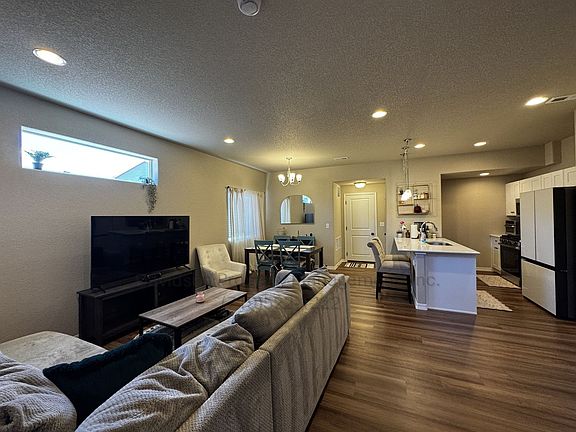 This spacious newer town home boasts a beautiful layout and modern touches, providing ample space for comfortable living. As you enter you are greeted with an open concept layout that seamlessly connects the large living room, gorgeous kitchen and dining area, perfect for entertaining or relaxing. The modern kitchen is equipped with sleek stainless steel appliances that compliment the crisp white cabinets, making meal preparation a breeze. There is a half bathroom on the main floor for added convenience. Heading upstairs you will find all three well sized bedrooms, a full hall bathroom, and a laundry area to make laundry days easy. The spacious primary bedroom has its own private en-suite bathroom with a double vanity. The house is complete with a two car garage for any additional storage needs and air conditioning for added comfort during the hot summers. There is also a pocket park right across the street and the beautiful Cumbre Vista Park around the corner perfect for outdoor days. This stunning 3 bedroom 2.5 bathroom townhouse is ready to be called home.