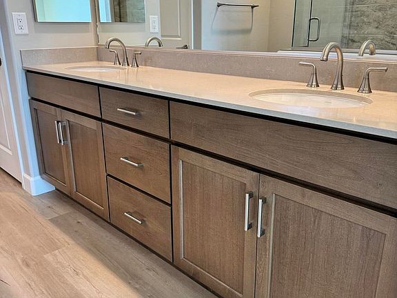 Kitchen: Woodcase Dublin Clear Alder Taupe Cabinets w/41'' Uppers. Quartz Countertops. Full Height Ceramic Tile Backsplash. Full Height Ceramic Tile Backsplash. Kohler Strive Stainless Steel Apron Sink. Delta Stainless Mateo Pull-Down Faucet. LG Stainless Steel Gas Appliance Package Includes:Convection Oven, Microwave, Dishwasher. Crown Moulding.Bathrooms:Curbless shower at Master Bath. Quartz Vanity with tile surrounds at Master Bath and Bath. Upgraded Delta Plumbing Fixtures in Stainless.Coordinating Delta Bath Accessories in Stainless.Outdoor Living: Pavers at PatioAdditional Upgrades: Cabinets at Laundry Room. Two-Tone Interior Paint. Upgraded Carpet and Wood/Laminate Flooring. Mitered Baseboards.8' Interior Doors