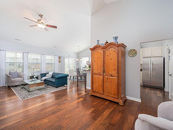 Welcome to this upgraded, well maintained 3-bedroom, 2-bath ranch featuring stunning 5'' plank hardwood flooring and vaulted ceilings. The heart of the home is the modern kitchen, complete with stainless steel appliances, elegant granite countertops, farmhouse sink and 42'' cabinets. Enjoy ceiling fans throughout for year-round comfort. Relax in the cozy 3-season room. Front yard overlooks a serene pond with a charming water fountain. The professionally landscaped yard adds to the tranquility, while fresh paint and a drywalled garage enhance the home's appeal. With custom owner's closet and laundry room storage, this move-in-ready gem offers both style and functionality. Don't miss out on this perfect blend of comfort and serenity! Seller may consider buyer concessions.
