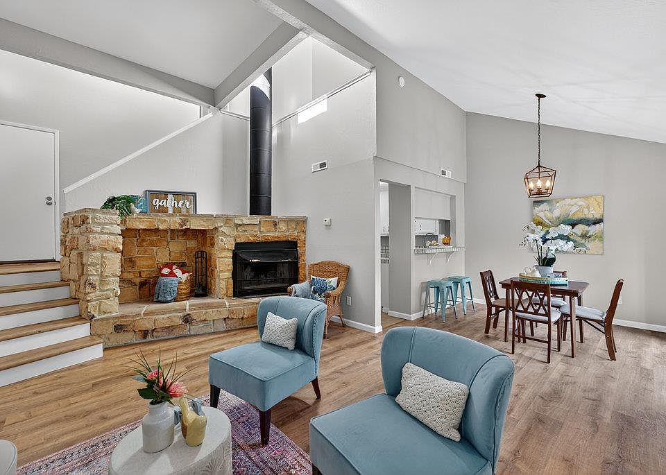 Flexible loftStriking stone fireplacePrivate balconyBeautifully landscaped front patioWarm wood floorsSoaring vaulted ceilings