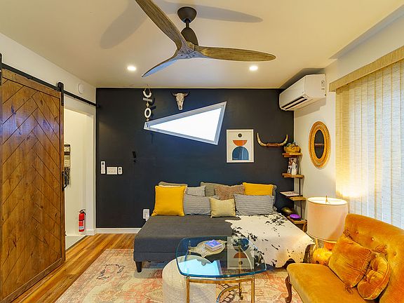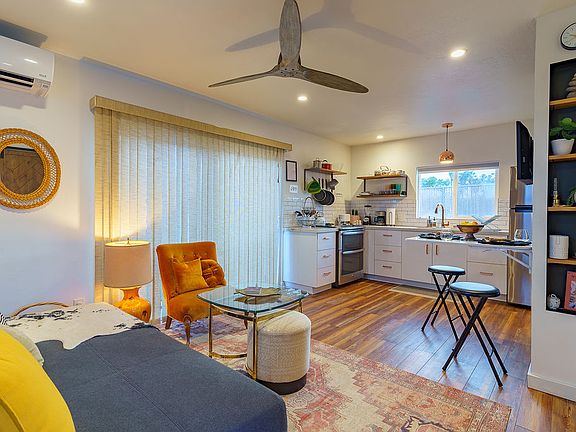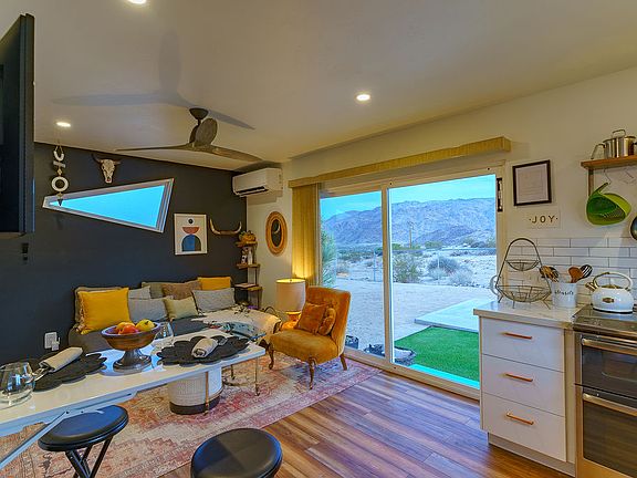 This beautiful desert home was renovated from a historic 1950's build, so we made sure to preserve its story by leaving some of its rustic charm behind in the design. Its tiny footprint of 1 Large Master Bedroom and 1 Bathroom, however it does not disappoint with its two-story open layout, amenities and creativity in every room. Its most unique feature is its playfully romantic master suite. It's perfect for a couple or a single person to unwind, create memories, and connect to nature. This home is a Joshua Tree National Park Gem!