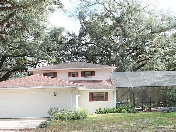 MAJESTIC GRANDFATHER OAKS grace this lovely 3 acre property near town. This property allows for horses or other farm animals. Front pasture with dressage course and training area with trail obstacles for showing and showmanship, etc. includes a recently shingled concrete block stable with tack/feed room and grooming area and one huge enclosed stall for mare & foal size and one open side covered exterior stall; (round pen not included). The interior stall has been used as two stalls. Also a separate open multi-use structure that has been used as hay barn. The 2-story home is quite spacious offering 5 bedrooms and 2 bathrooms upstairs plus rooms on the lower level that could convert to bedrooms if needed; spacious landing and large master bedroom and bathroom feature waterproof plank flooring. The first floor offers beautiful solid-red oak wood floors in most rooms including the large living room, library with built-in shelves, cozy sun room with fireplace and music room (which could accommodate many uses). The formal dining room, kitchen, downstairs bathroom and front alcove with open stairway that is adorned by hand hewn Florida Cypress banisters, and has diagonal tile that catch your attention. Large eat-in kitchen with ample counter space provides casual dining space and access out to the pool area. New granite counter tops and custom back splash as well as double wall ovens complete the kitchen. The roomy pool deck (pavers over concrete deck) of 30 x 50 and in-ground pool (fiberglass over marcite) will provide many happy hours of family fun and great entertaining, all under the screen enclosure. There is a first floor bath (new granite countertop) with access from the pool area as well. Don't miss the oversized attached garage accessed from the house through a multi-use room which has additional cabinets, storage closets and space for freezer. There are so many features to see including a tree house with slide, area for archery and air rifle practice with a covered concrete block backstop--this area could be converted to be a great location for dog enclosure or other uses. For sports enthusiasts, the mile long cul-de-sac is ideal for bicycling or jogging. Possibilities are endless with this property that is not your run-of-the mill suburbanite space; you can host the family reunion, the Super-Bowl party, or entertaining galore with abundant parking and play areas indoors and out! For sports enthusiasts, you will find 6,000 acres of Wildlife Management Area with fourteen miles of multi-use trails at the end of Frontier Drive.