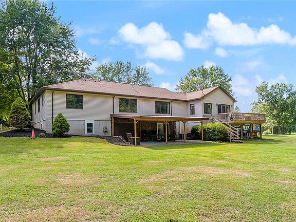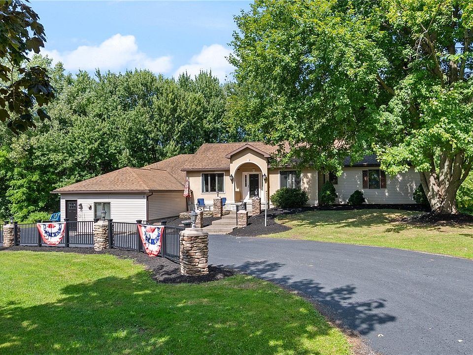 Wow! This home and property have plenty to offer sitting on 2+ acres at the outskirts of the village. Nice floor plan layout for enjoying time together. Primary bedroom has large walk-in closet, jacuzzi tub, plenty of built-in shelving spaces, and shares a natural gas fireplace with the family room. Large kitchen/family room with table area and island, and doors that open to a large deck overlooking the back yard. Former hair salon room off of the attached garage with a separate entrance. Full walk out basement with 7'-9" (approx) ceiling height, a finished room, a game room that opens to a covered large patio area, a work/shop room that has a 9'x7' overhead door that opens to the covered patio, a utility room, and an exercise room. Well landscaped large yard to enjoy plenty of outdoor activities. 10'x11' shed in backyard. The large open wrap around deck and open patio area offer plenty of space to relax and enjoy the property. 3-6+ miles from Lake Ontario, Port Bay and all of the water activities, a public golf course, and State land for hiking and cross country skiing. This property and location have plenty to offer all year around.