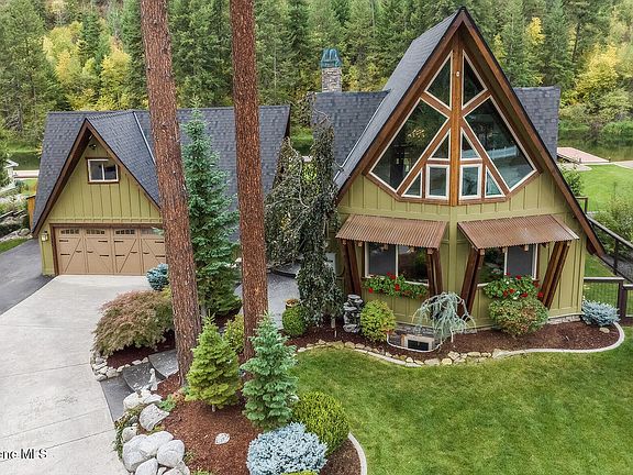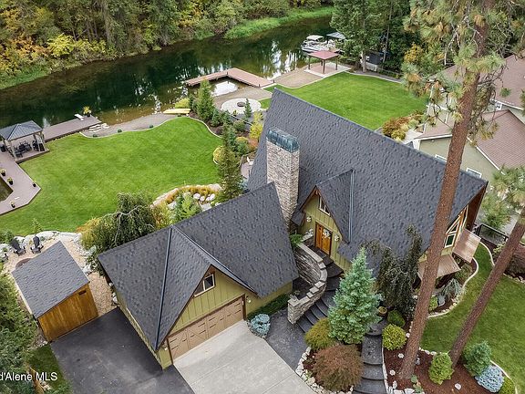 Nestled on the exclusive Harbor Island in Coeur d'Alene, this North Idaho waterfront home offers unmatched privacy & serene natural beauty. Positioned along a quiet, pine-lined channel of the Spokane River with calm waters, minimal boat traffic, & a peaceful setting. This 2,880sqft residence sits on a meticulously maintained 0.37-acre lot & features vaulted timber ceilings, expansive windows that fill the space with natural light, & a beautifully crafted custom kitchen. With 4 bedrooms, 3 full bathrooms, a spacious layout, & an oversized 2-car garage, the home blends comfort, function, & high-end design. Professional landscaping frames a tranquil backyard oasis complete with a sandy beach, private dock with a 30-foot boat slip, diving board, covered lounge area, & a wood-burning sauna for year-round relaxation. Additional upgrades include a powerful 21KW Generac generator & a new roof installed in 2022. Enjoy the tranquility of waterfront living, with downtown CDA just 10 minutes away