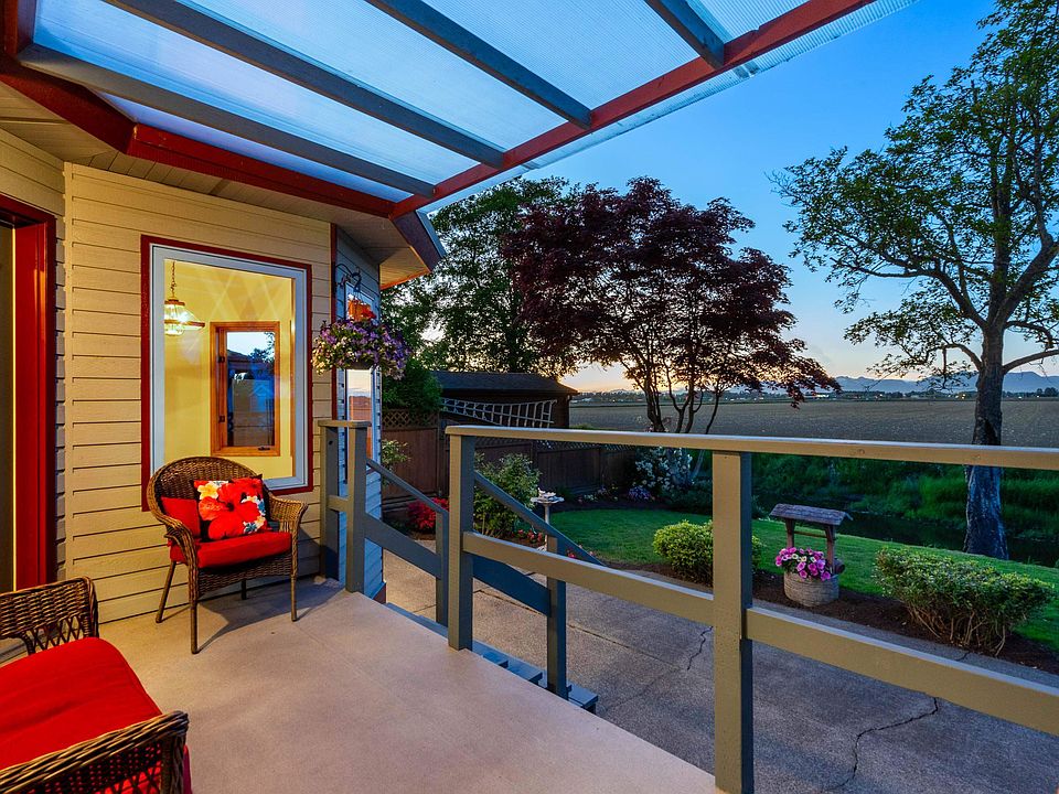 RANCHER with stunning MOUNTIAIN + FARMLAND VIEWS year round! This very special custom built property has 9' ceilings and gleaming hardwood floors in the open concept family room and kitchen plus French doors leading to deck and the perfectly landscaped private yard. Formal living room with gas fireplace with adjacent dining room. Primary bedroom on the main features second French door and a gorgeous ensuite (2022) with walk in shower and heated floors! Upper floor has two more bedrooms, and huge storage/attic space. Total of 2059 sq.ft of living space. Large over height garage, easy access to crawl space, HRV system, roof 2016, hot water tank 2021. Ramp to front door can be removed! RV+sewer drain/trailer/boat parking. A rare find!