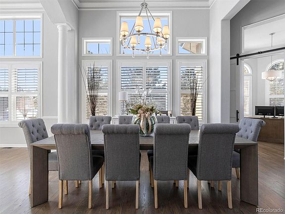 Offering both privacy and views, this 6 bed | 6 bath mountain modern home has been FULLY updated down to the door hardware, creating a rare opportunity to move into the gated Village at Castle Pines community right away. The dramatic two-story foyer welcomes you into a sunlight-filled residence designed for seamless indoor | outdoor living. The coveted chef’s kitchen features Quartzite countertops, custom tile backsplash, and a breakfast nook with built-in coffee bar, opening to an expansive deck with breathtaking mountain vistas, unforgettable sunrises, and Castle Rock’s twinkling night lights. Adjacent to the kitchen, the airy family room is anchored by a stone fireplace and a window wall framing picture-perfect views, with a nearby flex room ideal for play, work, or hobbies. Restoration Hardware-inspired living and dining areas set the stage for memorable gatherings, while a quiet front office, guest powder bath, laundry, and three-car garage complete the main level. Upstairs, the serene owner’s suite offers a sitting area, gas fireplace, and a spa-inspired primary bath with spacious walk-in closet. Three secondary bedrooms, an upstairs loft, and two refreshed bathrooms complete the upper floor. The finished lower level is designed for entertainment and gathering friends and family alike with a media lounge, wet bar, fitness/guest room, steam shower bath, additional powder room, and theater with walk-out access to the backyard. The lower-level exterior boasts a flat back yard, sunrise views, and sports court. Located just 30 seconds from gate 5 which is close to schools and highway access, a 5-minute walk to The Summit Club pool, park, and playing fields, and a 2-minute drive to the recently renovated and expanded Country Club at Castle Pines, this home's location can't be beat. With premium features including a structural steel subfloor, this residence is a perfect balance of modern features and livability in one of Colorado's most sought after communities.