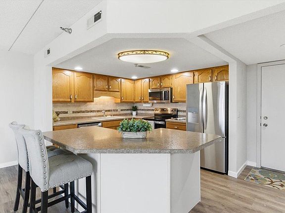 doors that allow endless natural light into the unit, the exceptional 7th floor view from the balcony, the spacious full bathroom, and the inviting kitchen island in the center of the home. If that wasn't enough, enjoy the many communal perks, offered by the association, including; cable/internet, an indoor + outdoor pool, water/sewer/trash services, fitness center, snow removal/lawn care services, a toasty sauna, and a rentable party room. With multiple dining options, grocery stores, schools, and parks