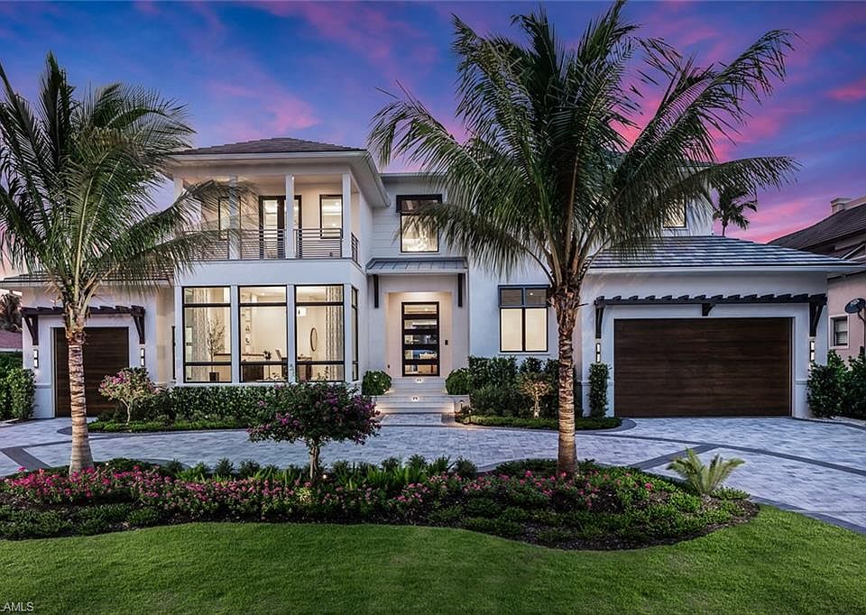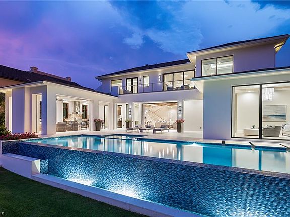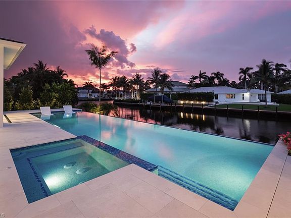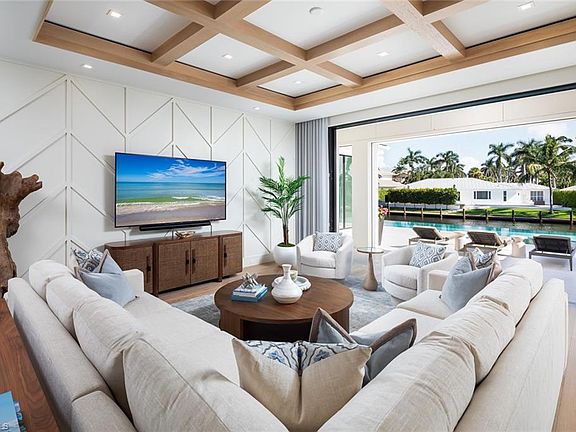 Showcasing light and breezy seaside-inspired aesthetics complemented by warm natural wood tones, this newly constructed masterpiece by Wilbrett Construction Company is a testament to exceptional craftsmanship. Designed with sophistication by Kukk Architecture and finished with the exquisite touches of Freestyle Interiors, this home spans approximately 6585 square feet of meticulously planned living space, adorned with luxury features at every turn. Step into a grand great room where intricate ceiling details add a touch of artistry and seamlessly flow into the chef's kitchen complete with custom cabinetry and a well-appointed butler's pantry. Adjacent to this central space, a wet bar and temperature controlled wine cellar perfectly complement a spacious study, offering a refined retreat with custom cabinetry that harmonizes functionality and elegance. The main-floor primary suite offers tranquil water views and a spa-inspired bath featuring a freestanding soaking tub and a walk-in shower. Upstairs, four generously sized ensuite bedrooms encircle a central living area, which includes a wet bar and access to an extended balcony that captures spectacular wide water vistas. Outdoor living is a dream come true with a resort-style infinity-edge pool, soothing spa, and sun shelf, surrounded by a covered loggia outfitted with remote controlled screens and shutters. A stone-clad fireplace creates a cozy ambiance, while the outdoor kitchen makes hosting gatherings effortless and enjoyable. Ideally situated on the waters of Egret Channel, with its prime location at the intersection of Heron Cove and Gull Cove, the property takes full advantage of sweeping water views. Boating enthusiasts will appreciate the deep-and wide water frontage, ideal for navigable access. This serene setting is also just moments from Naples' pristine white sandy beaches and the shops and restaurants of Third Street south. This thoughtfully designed residence embodies the quintessential Florida lifestyle, offering a rare blend of elegance, comfort, and functionality.