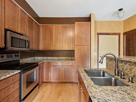 This apartment features an east facing wall of windows, an open floor plan, high-end kitchen with cherry/maple cabinetry, stainless steel appliances, and granite countertops with eat-at bar.
