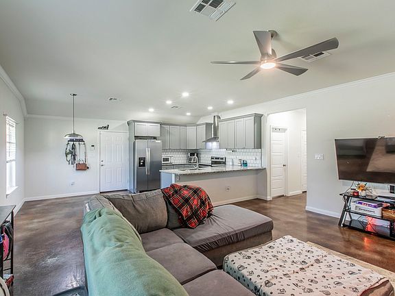 Step inside to be greeted by the home's open-concept design, showcasing concrete floors that span the main living areas, providing both durability and a sleek, modern aesthetic. The spacious kitchen boasts ample counter space, and a tasteful backsplash, perfect for any home chef.