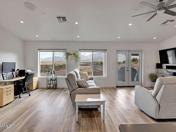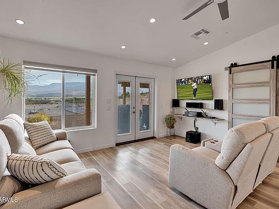 Welcome to Casa Contenta, a one-of-a-kind, retreat in the heart of the Verde Valley. Perfectly positioned on a private hilltop with only ten custom homes, this magnificent 2.58-acre property offers a lifestyle of tranquility, versatility, and breathtaking natural beauty. Experience unparalleled views of Mingus Mountain and dazzling city lights, all without the constraints of a homeowner's association. This exceptional estate, with a 2021 Certificate for Occupancy, features three separate, custom-built buildings: a modern farmhouse main house, a charming guest house, and a massive detached shop. Built with meticulous attention to detail and efficiency, Casa Contenta is more than a homeit's a sanctuary designed for multi-generational living, a thriving home business, or simply your ultimate personal escape. The Main House: A stunning 1,359 sq. ft. modern farmhouse awaits, with a bright, open split-floor plan and beautiful laminate waterproof flooring throughout. The gourmet kitchen is a culinary masterpiece, featuring upgraded countertops, an oversized farmhouse sink, and sleek slate/stainless steel appliances. The Guest House: Designed as a modern cabin with rustic accents, the 608 sq. ft. guest house offers a private retreat for visitors or a fantastic rental opportunity. It includes a bedroom, a .75 bathroom, and a covered patio with amazing views, ensuring a comfortable and private stay.