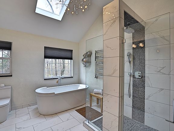 Spectacular center hall Colonial offers classic features with chic, modern updates, open concept for entertaining, walls of windows, hickory floors, and neutral tones perfect for all your lifestyle needs! Covered porch with stone surround front invites you in to the two-story foyer, the elegant living room opens to family room with granite surround fireplace. Modern kitchen with pendant lighting, galley style white Macabus stone countertop overlooking designer prep area with 4 burner cooktop, glass exhaust, wood butcher block & double wall ovens. Sliders lead to maintenance free multi-tiered solar post lit deck perfect for outdoor gatherings. Office/bedroom and laundry on 1st floor. Luxurious master suite with 2 walk-in closets, mirrored sliding barn door entry sitting room, and spa-like bath with soaking tub and walk-thru glass face shower with soothing rain showerhead. Full basement for you to design as well as two car garage and manicured professionally landscaped. This lot expands to the back street for an amazing yard.