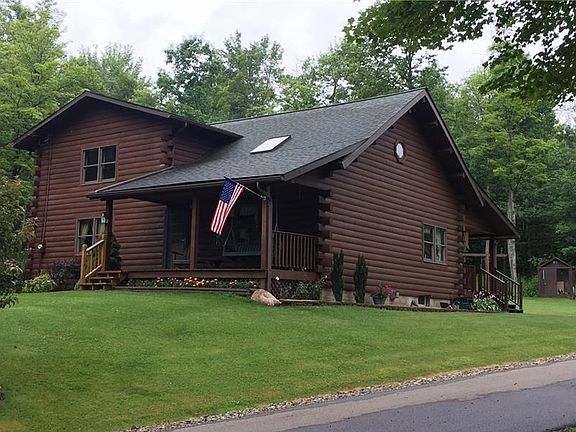 Complete peace and tranquility in this beautiful log home on 37 acres. Enjoy a nice evening sitting in the hot tub overlooking a well manicured yard and the woods. An outdoor hardy wood boiler was installed in 2015. Whole house air conditioning was installed. The main bath was remodeled it has heated ceramic tile floor. The loft offers a nice den or office space overlooking the living room. Four skylights in the home offer lots of natural light. The basement has a nice space for a game room and a large laundry area with an additional sink, toilet and shower. On the outside a new roof was put on the house and the garage. The driveway was paved in 2015 was resealed August 2017. The deck on the back leads up to an upper deck with a hot tub. There is a nice swing in the backyard and also a shed for extra storage. In the two car detached garage it has a full floored walk up attic for storage. Additional drive with access to trails leading to several hunting stands.