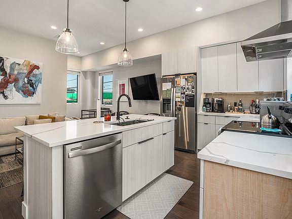 Discover modern living in this stylish end-unit townhome built in 2017, featuring high-end finishes, soaring ceilings, and expansive windows that flood the space with natural light. The open-concept layout includes a sleek kitchen with stainless steel appliances, generous counter space, and direct access to a private balcony perfect for morning coffee or evening cocktails.