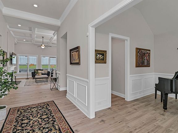 Back deckHalf bathroomEn-suite bathroomCoffered ceilingLarge kitchen islandLuxury vinyl plank floorsTile backsplash