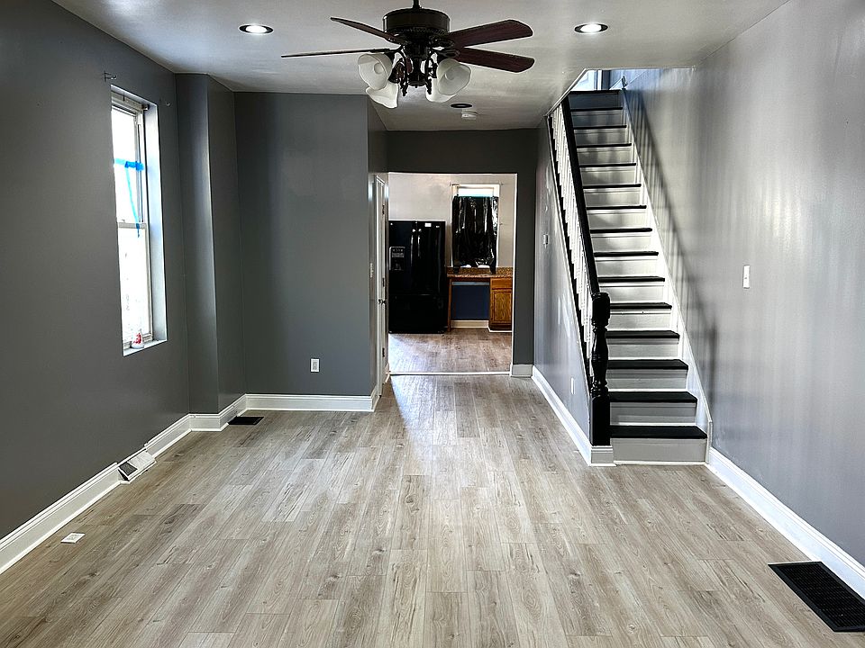 Renovated rowhomeCentral air conditioningStainless steel appliancesOff-street parkingWood-like flooringQuartz countertopsGourmet kitchen