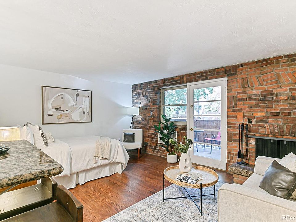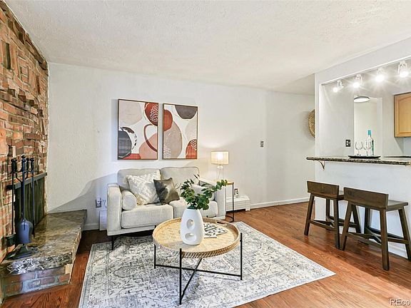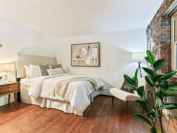 The condo’s efficient floor plan has distinct areas for sleeping, living, kitchen, dining & Work From Home space. Living room has French door to balcony, brick feature wall & wood-burning fireplace with stone tiled hearth seat. Enjoy sitting on your own balcony perched above everything and surrounded by mature trees. The east-facing covered balcony, overlooking Pennsylvania St, measures 10’9” by 6’9” and creates more living space. Kitchen has wood floors, light-colored wood cabinets, new lighting & granite slab counters. Dine at the granite slab breakfast bar that seats 2 stools. A quiet Work from Home space has been created away from the living area. Full bathroom has two separate areas: granite slab vanity with vessel sink & double stack cabinetry and private room with tub & toilet. A quiet Work from Home space has been created away from the living area. The closet is 12-feet long! Extra condo features: site-finished stained wood floors, new wall & ceiling paint throughout & new light fixtures throughout. The red brick building features secure front & back entrances, 2 elevators & a laundry room on each floor. Residents can enjoy the community room & rent it for personal events. More extras in the community room include fitness area with workout equipment, bathroom, shower & sauna. HOA pool has large deck for lounging around the pool as well as two BBQs. Parking space number 12 is located near back door. Walk Score is 95 & Bike Score is 99 which means daily errands do not require a car & can be accomplished either walking or on a bike. The condo is steps away from Trader Joe’s, Carboy Winery, Syrup & many other restaurants on 6th & 7th Ave. Enjoy Gov’s Park & Cherry Creek Trail. Just minutes to Cherry Creek & Downtown Denver. This low-maintenance turn-key condo has a lot of living in an eco-friendly footprint.