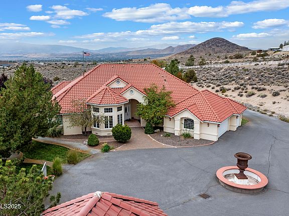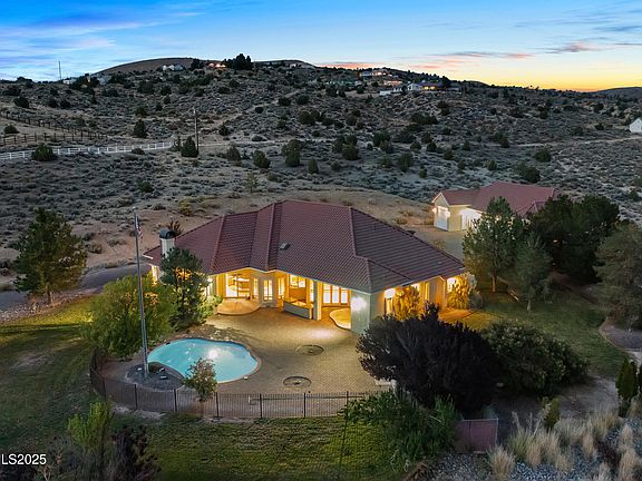 This sprawling estate located in the Spanish Springs Valley Ranches is a must see! When you come up the gently winding, private driveway you will be greeted by a beautiful Spanish style custom home on over 10 acres with gorgeous mountain & city views! The main house features 3373 sqft and is the perfect place to entertain with a beautiful gourmet kitchen, breakfast nook, 3 bedrooms, 3 full bathrooms, 1 guest half bath, wet bar's galore and a 3 car garage. Step out of your primary bedroom to the large patio where heavenly views of Mt. Rose and the city await you! The outdoor in-ground pool is a beautiful feature complete with separate bathroom and outdoor shower. If you love to dine al fresco...this is the place for you as the patio has entrances from the kitchen, the family room and the formal siting room. Behind the pool pump house is a small dog run with room for growth, bring your family and your furry friends! The 2784 sqft RV garage features room for an open shop, a storage closet and even has an upstairs workout room waiting for your personal fitness touches. There is plenty of parking for guests, either in the garage or around the driveway. Attached to the RV garage is a separate 1044 sqft casita. It can be accessed from the garage or has a separate main entrance from the driveway. When you enter the casita you will be greeted with high ceilings, mini-fridge, sink, lots of cabinets, a bedroom, a full bathroom and loft area located at the top of an industrial-style spiral staircase. Did we mention the cellar built into the side of the hill? Can be used for wine, a root cellar or your food storage needs. Bring all your toys and your imagination with you as there's room for growth with 10.121 acres and no HOA! Who knows, a future barn? Horses close to BLM land access, a petting zoo?? The possibilities are endless at this one-of-a-kind luxury compound complete with a Generac Generator installed in 2022. Don't let this one get away!