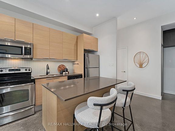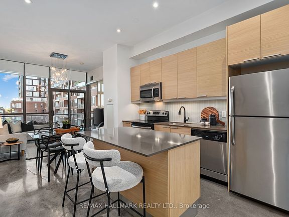 Stunning Edge Lofts 2 bedroom, 2 washroom, south-east corner suite, large balcony along with a rare and high demand underground parking & locker (directly in front of the parking space). Perfectly situated in Riverside at Queen St E & The Don Valley, just west of Leslieville. This bright and airy unit is on the quiet side of the building. Open concept layout includes 10-ft smooth ceilings with pot lights, polished concrete floors, and floor-to-ceiling windows. The modern kitchen features stone countertops, a glass tile backsplash, stainless steel appliances, an under-mounted sink, and a spacious island with a breakfast bar. Two spacious bedrooms share an ensuite with a deep soaker tub, and the primary includes his & hers closets for optimal storage. A separate powder room, front entry coat closet, and built-in storage solutions add practicality. Enjoy warm summer nights on your large private balcony, ideal for dining or relaxing. Convenient visitor parking. This unit offers unbeatable access to downtown and transit, with the DVP on-ramp right outside, the Queen streetcar along with the upcoming Metrolinx Ontario Line just steps away! Walking distance to The Broadview Hotel, and all the trendy shops & restaurants Queen St E has to offer. Meticulously maintained and freshly painted, just move in and enjoy loft living at its finest!