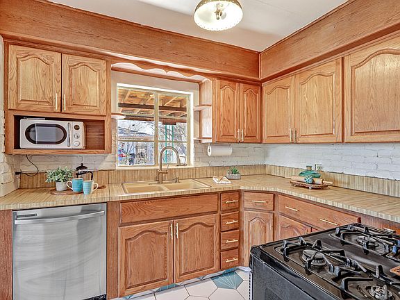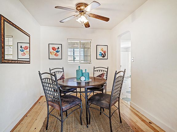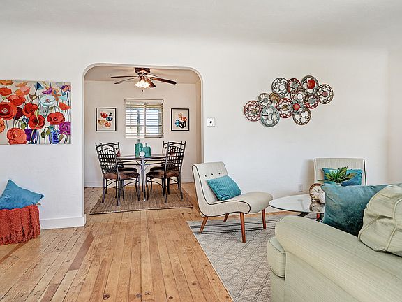 Cool 1950's bones constructed of highly insulating terrone adobe! A welcoming covered front porch beckons you into the cozy living room where its classic fireplace and timeless pine wood floors are brightened by the large front window. Darling vintage bathroom, cheery eat-in kitchen plus dining or study area. The spacious flex room with cork floors and a fireplace, recently used as a music studio, can be a 3rd bedroom, family/entertainment room - use your imagination! This North Valley charmer has coyote fencing with two gates that grant you access to the carport or backyard where you can enjoy the Sandia Mountain views. Furnace replaced in 2023 and evaporative cooler installed in 2019. Close to coffee shops and numerous trails - many shaded by stately old Los Ranchos cottonwoods.