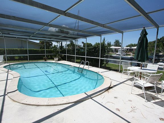 NO FIXED BRIDGES 100' Water Frontage True Florida lifestyle home in one of the most sought after areas in the Palm Beaches! Spacious four bedrooms, two bath pool home on water! This charming residence has many unique touches throughout such as two corner half glass china cabinets in the formal dining room. The kitchen has been upgraded with granite counter-tops, pull-out white cabinetry and upgraded appliances. The pool and waterway views can be appreciated from all areas especially the spacious master bedroom. The backyard features both large in-ground pool with screen enclosure and lush landscaped area with mature trees. Weather relaxing in the pool or under a tree you can will enjoy the stunning water views and equally beautiful surrounding area. (dock with 100' ft. waterfront and seawall).