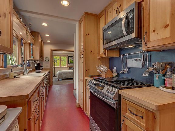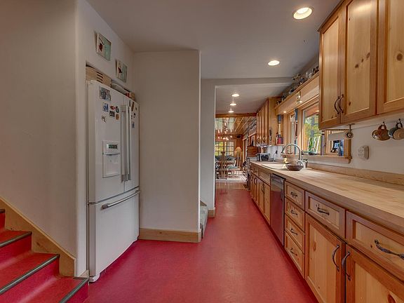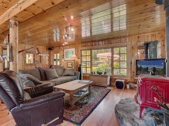 Inside this winter wonderland, a beautiful knotty pine touch to the walls and ceiling welcomes you. The rich smell of hot chocolate or coffee will just radiate into the well outfitted open family room from the modest galley style-kitchen beyond.