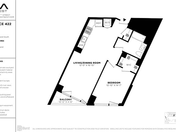 FARE Act Disclosure. This listing is intended to be used by prospective renters and may not be republished without the prior written consent of The Durst Organization. Absent an express written agreement or acknowledgment to the contrary, The Durst Organization and its affiliates (1) do not utilize the services of third-party brokers or agents in connection with the rental of residential apartments and (2) will not assume responsibility for any brokerage fees incurred by a prospective renter. The Durst Organization and its affiliates will not charge or collect fees from a prospective renter except for such fees as permitted by law and disclosed to the prospective renter.