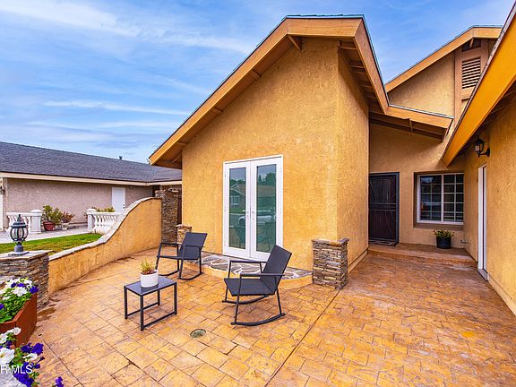 Experience refined single-story living in this beautifully updated 3-bedroom, 2-bathroom home nestled in a desirable Camarillo neighborhood. The heart of the home is the thoughtfully remodeled kitchen featuring quartz countertops, a waterfall peninsula with extra storage, a deep stainless sink with touch faucet, and clever details like spice drawers, under-cabinet lighting, and Le Mans pull-outs—designed with both beauty and function in mind. The open floor plan flows seamlessly into a sunlit living room with remote-operated skylights, built-in LED lighting, and a whole-house fan that draws in cool evening air. The spacious primary suite includes a walk-in closet and a luxurious, spa-like bath with dual vanities and contemporary finishes. Beautifully hardscaped front and back, this home also features engineered plank flooring, dual-pane vinyl windows, and low-maintenance, water-wise landscaping. Enjoy privacy and mountain views from the shaded patio, complete with infrared heaters, a built-in BBQ entertaining bar, rock water feature, and a versatile sunroom for year-round enjoyment. Additional upgrades include a Moen water softening and leak detection system, re-piped plumbing, an EV charging station with a 50-amp panel, built-in garage storage, and an oversized driveway. This home is the perfect blend of modern convenience and everyday comfort—ready to enjoy from day one.