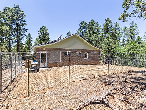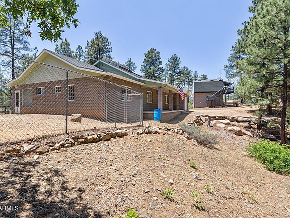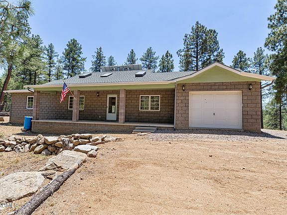 Embrace off-grid living in this custom-built block home nestled amidst the tall pines of Prescott National Forest. The 1,688 sq. ft main house features 2 beds, 2 baths, maple kitchen cabinets, and an enclosed patio leading to a fenced yard. A detached garage hosts a 363 sq. ft studio with a kitchenette and trex porch, offering panoramic views. Radiant floor heat, owned solar panels, a well house with a 1,000-gallon tank, 3,000-gallon water storage, and 2 500-gallon propane tanks ensure self-sufficiency. Enjoy privacy on 2.5+ gated acres at 6250 E Bannie Mine!