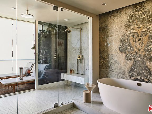 Inspired by the eminent Griffith Observatory perched atop the Hollywood Hills, this fully furnished three-bedroom, five-bathroom home offers a "retreat room," library, custom-designed closets, powder room and multiple entertainment spaces spanning across 5,078 square feet. In collaboration with top-tier luxury interior design firm, SFA Design, the penthouse features custom bespoke design aesthetics throughout the open indoor spaces, floor-to-ceiling Nano glass walls separating the interior living area from the vast 1,251 square feet of private terraces. Suffused by natural light, this penthouse features a unique, upscale industrial style with rough-hewn wood finishes, polished marble and fixtures reflecting a hand-made European craftsmanship. In addition to its spacious living quarters, The Griffith is home to Hollywood's sexiest shower, which took more than 400 hours to design, build and finish with gorgeous views of the sweeping Hollywood