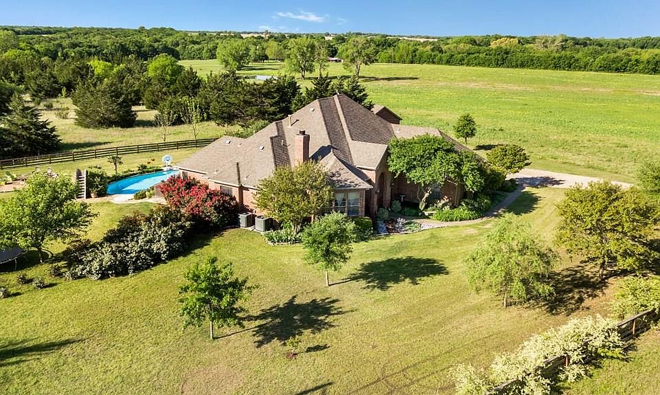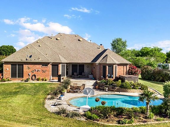 One acre custom home with a pool, peaceful and private, in sought after Van Alstyne ISD. Entry draws you in with wood floors, high ceilings and well maintained elegance. One story stunner is perfect for entertaining. Fabulous kitchen of granite countertops, island, counter seating. Private master bedroom in separate wing from other ancillary bedrooms. Master bath is large with many cabinets, under counter heater vents and master closet is custom styled and huge. 2nd MIL with full bath. Delight in two other bdrms with with Jack and Jill bath. Enjoy huge outdoor patio, pool, and fire pit surrounded by open acreage views. 18x20 workshop w electric perfect for hobbies.