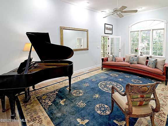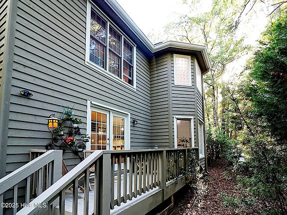 Nestled within the serene Indigo Plantation & Marina in historic Southport, NC, this unique house invites you to experience comfort with an eclectic blend. Situated on a .57-acre corner lot, this property offers abundant outdoor space and a sense of privacy, thanks to the verdant tree canopy that creates a tranquil treehouse ambiance both inside and out. Four hip roofs add not only superior stability and durability to the home but also contribute to an aesthetically appealing exterior. Spanning 2,673 square feet, this thoughtfully designed residence features three spacious bedrooms and two full bathrooms, along with a dedicated study/library that is perfect for work or quiet reflection.