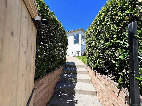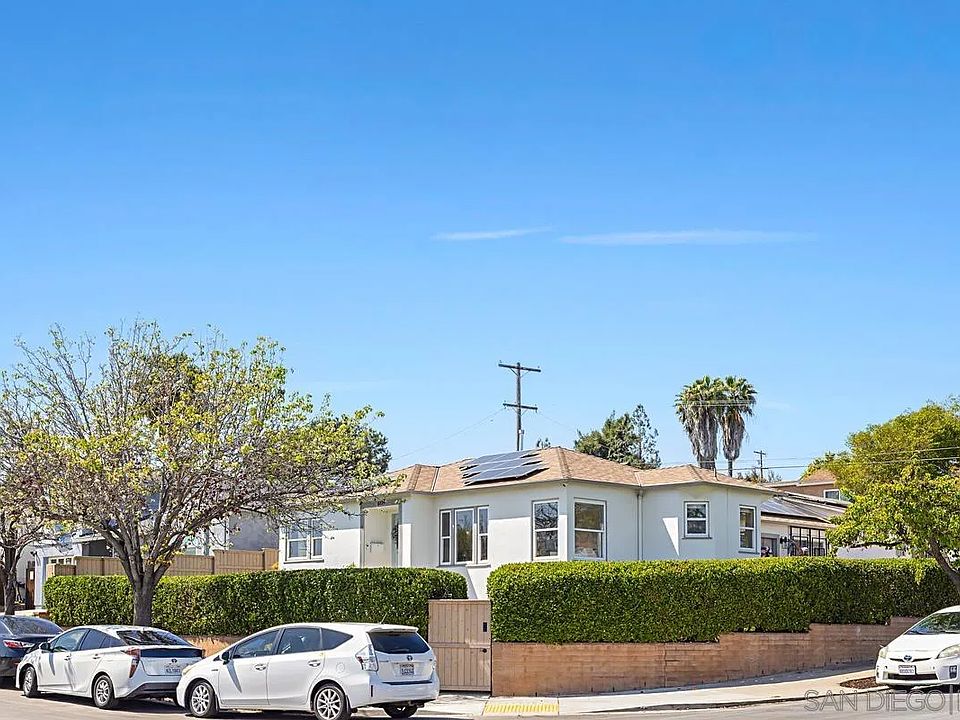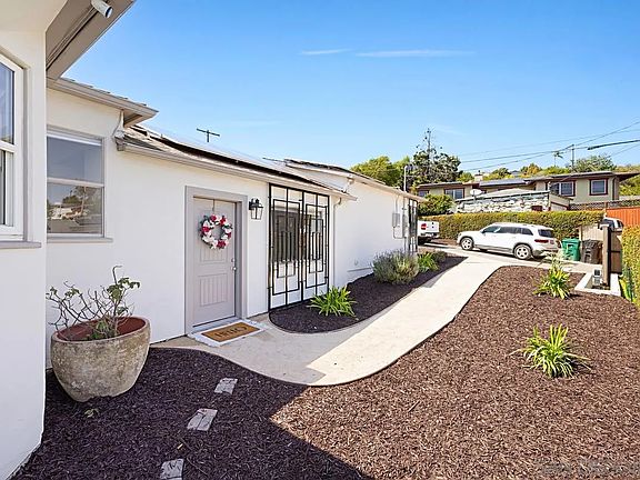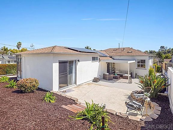 Nestled in the peaceful neighborhood of Rolando Village, this delightful 3-bedroom, 2-bath California bungalow offers the perfect blend of cozy charm and modern comfort. Situated on a generous corner lot, the home provides ample outdoor space for relaxation, gardening, or entertaining. Enjoy the serene natural privacy surrounding the property, with manicured hedges and lush landscaping creating a secluded and tranquil atmosphere. The fully fenced yard and automatic gate add an extra layer of security & protection. Inside, the home features an inviting layout with spacious rooms, original wood floors, and an abundance of natural light. The front area of the house provides access to two bedrooms and a full bathroom. A modernized kitchen with vintage accents, featuring a walk-in pantry and nook for the washer & dryer. The rear of the home features a sunken Livingroom with sliding doors that lead to the backyard patio. Additionally, the spacious primary bedroom includes a renovated en-suite bathroom, walk in closet and its own set of sliding doors to the patio, creating a seamless connection between indoor and outdoor living. The Enphase system offers 20 solar panels that was purposely oversized to also have the ability to power a Car Charger, Hot Tub or even an ADU. Two attics with ample storage space.