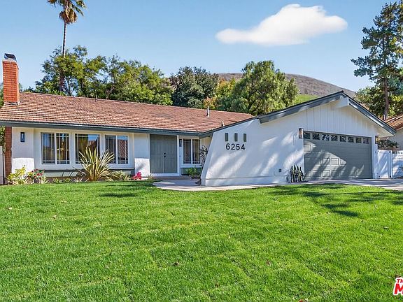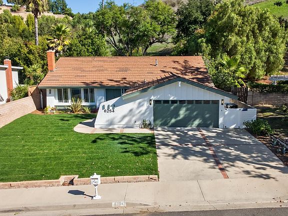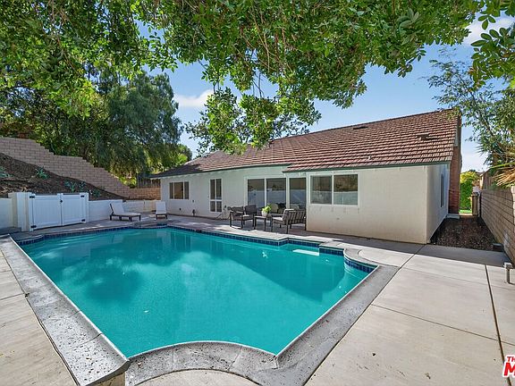 Beautifully updated single-level California Ranch in the highly desirable Fountainwood neighborhood of Agora Hills, with a sparkling pool + spa and a private hillside backdrop. Dripping with curb appeal, the refreshed facade pairs smooth white stucco with board-and-batten accents, wide picture windows, manicured lawn, and an extra-wide driveway leading to a modern paneled two-car garage. Entry opens to a refined, sun-drenched formal living room anchored by a sleek tiled decorative fireplace, vaulted ceilings with beam detail, recessed lighting, and a wall of windows, which flows into the adjacent dining area with modern chandelier and picture window. Rear family room with soaring high vaulted ceilings captures backyard views through expansive glass sliders for perfect sightlines to the pool and spa. Remodeled chef's kitchen is a showstopper with white Shaker cabinetry, quartz countertops, full-height navy herringbone tile backsplash, stainless appliances, a deep single-basin sink with pull-down faucet, abundant recessed lighting, and durable large-format tile flooring, while a wide kitchen window overlooks the patio and pool. The spacious primary suite offers recessed lighting, a dressing area with mirrored wardrobe, and an updated bathroom featuring a new vanity, matte-black fixtures, and a frameless glass shower, niche storage, and pebble-style mosaic floor. Three additional large bedrooms are bright and restful with dual-pane windows, LED lighting, and mirrored closets. The chic hall bath echoes the curated palette with designer pattern-set subway tile over the tub/shower, frameless panel, new vanity, and matte-black hardware. Resort style back yard features a new expansive low-maintenance concrete patio wrapped around a large sun-drenched pool and circular spa. Multiple zones for lounging, dining, and play; broad walkways provide easy circulation all the way around the pool. Terraced hillside with new drought-tolerant plantings and mature shade trees.  Moments from hiking trails, parks, popular shops, restaurants, and the newly reimagined Whizin's Center. This is a MUST SEE!