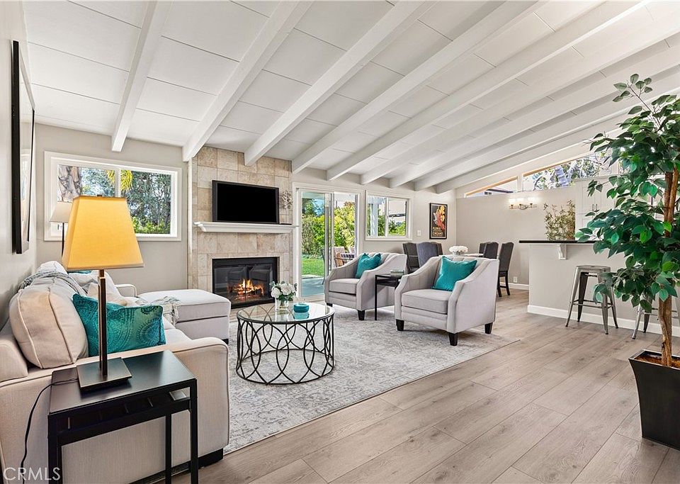 As you enter the home you are welcomed by an open living room with a fireplace, wood floors throughout, and lit up with natural sunlight from the mid century modern style windows near the ceiling. Entertain family and friends from the updated kitchen with stone countertops, shaker cabinets, and convenient raised countertop to place snacks for guests. Off the living room is a bedroom with outdoor private seating area, and on suite bathroom, perfect for a home office, guest room, or primary bedroom. As you head down the hallway you pass the laundry closet with front loading washer/dryer. Along the hallway you will find the remaining three spacious bedrooms all with wood floors and and mirrored closet doors and closet systems. A central located bathroom with stone countertops and tile lined shower/tub combo. All of this on a 10,018 sf lot complete with multiple outdoor seating areas and a pool. Who wouldn’t want to relax after a long day, take a break from working from home, or even work from home by the pool and enjoy the Southern California weather? If outdoor space and an updated home is what you are looking for, then this is a must see.