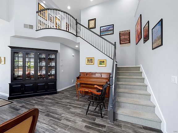 Sorrento Valley Stunner! Situated on a peaceful canyon lot, this spacious 4 bed 3 bath home offers endless upgrades and gorgeous South Westerly views! The open and bright floorplan features soaring ceilings, wood tile flooring, updated fixtures & finishes, Milgard energy efficient windows with shades/window treatments, cozy fireplace, a meticulously renovated kitchen with granite counters, vibrant cabinetry, glass tile backsplash, upgraded appliances, farmhouse style sink, and island with breakfast bar. First floor bedroom and full bath perfect for guests or in-laws. Upstairs includes a palatial master retreat with expansive views, 2 additional bedrooms and a generous loft/bonus room. Additional upgrades include: tankless water heater, updated toilets and tile in baths, car charging station in garage, interior painting, storage racks in garage and alarm system. Recently painted exterior, wooden fencing installed and drought tolerant landscaping for superb curb appeal!