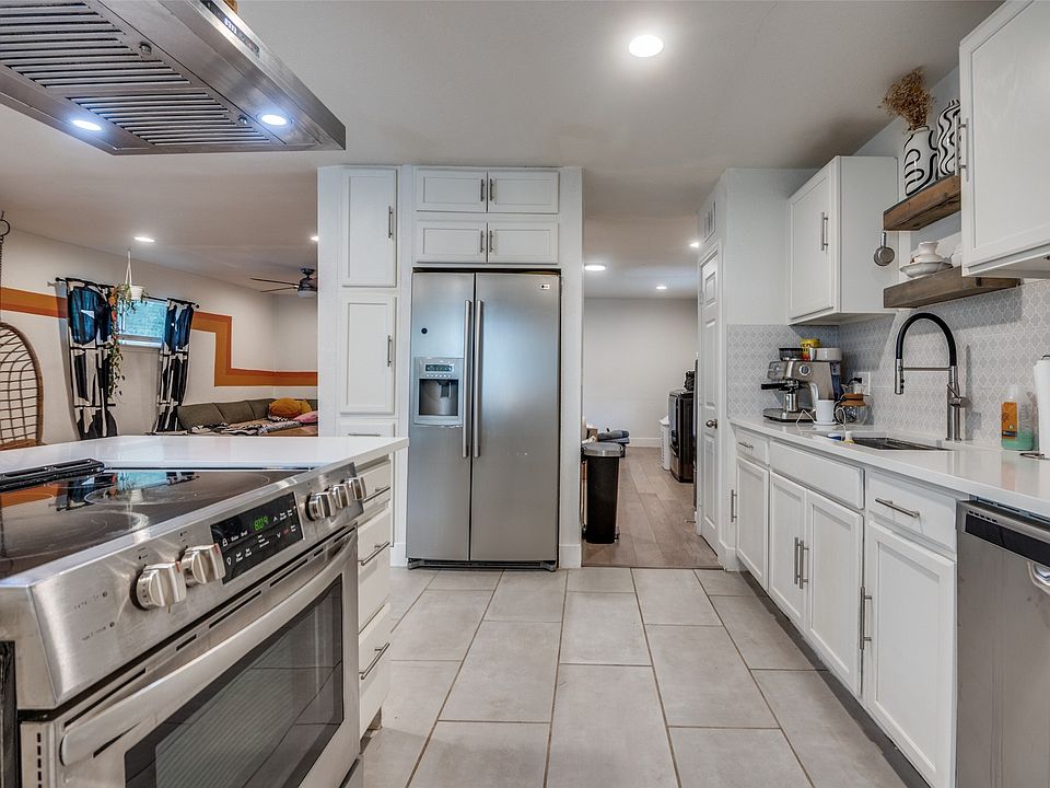 Open floor planStatement light fixtureSeparate dining roomWood-look vinyl flooringQuartz countertopsOversized laundry roomBright updated kitchen