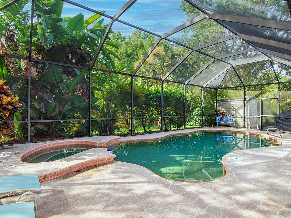 HUGE REDUCTION IN PRICE !! 3 BEDROOM, 2 BATH, SAFE CONCRETE BLOCK POOL HOME WITH FORMAL LIVING ROOM AND DINING ROOM. GORGEOUS KITCHEN WITH PANTRY OVER LOOKING GREAT ROOM AND BREAKFAST NOOK. OVERSIZED MASTER SUITE WITH SEPARATE SHOWER & TUB AND LARGE WALK THROUGH CLOSET. LAGOON STYLE POOL IS SCREENED AND SURROUNDED BY TROPICAL FOLIAGE. READY TO MOVE IN. MOST FURNITURE NEGOTIABLE.